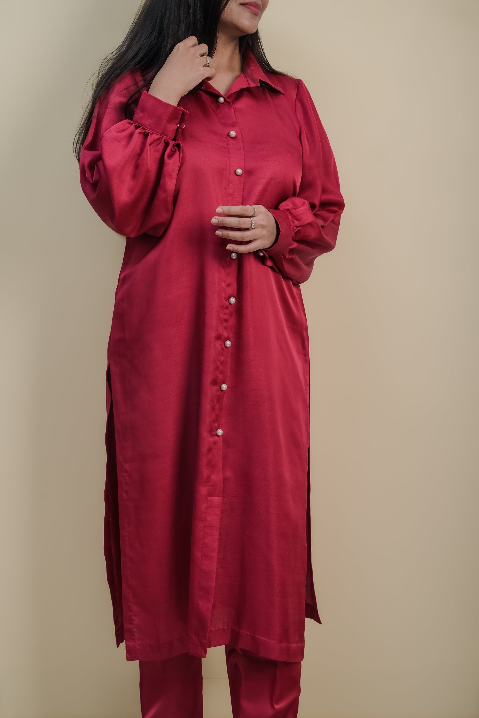 - Pearl detailing's add a touch of elegance, while the collared neck and cuffed sleeves make it simply stunning.