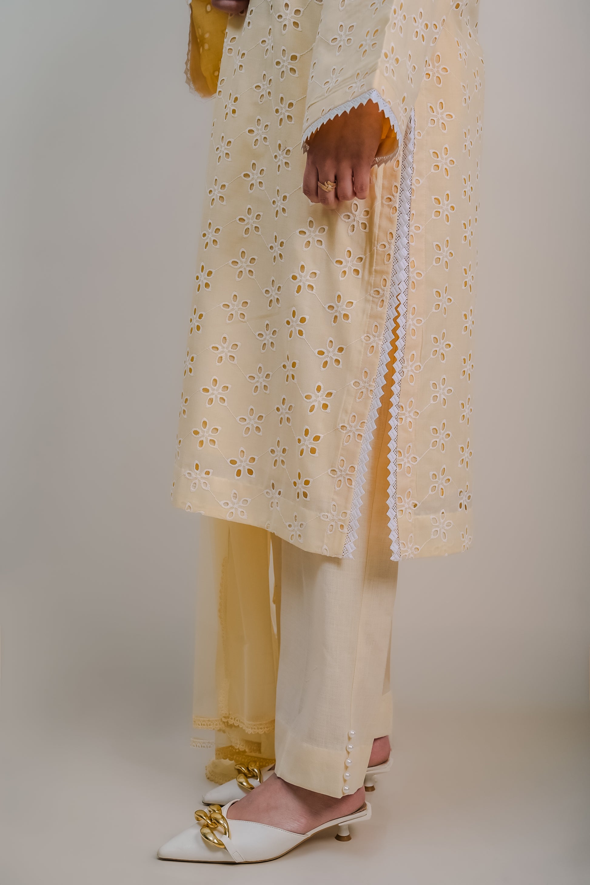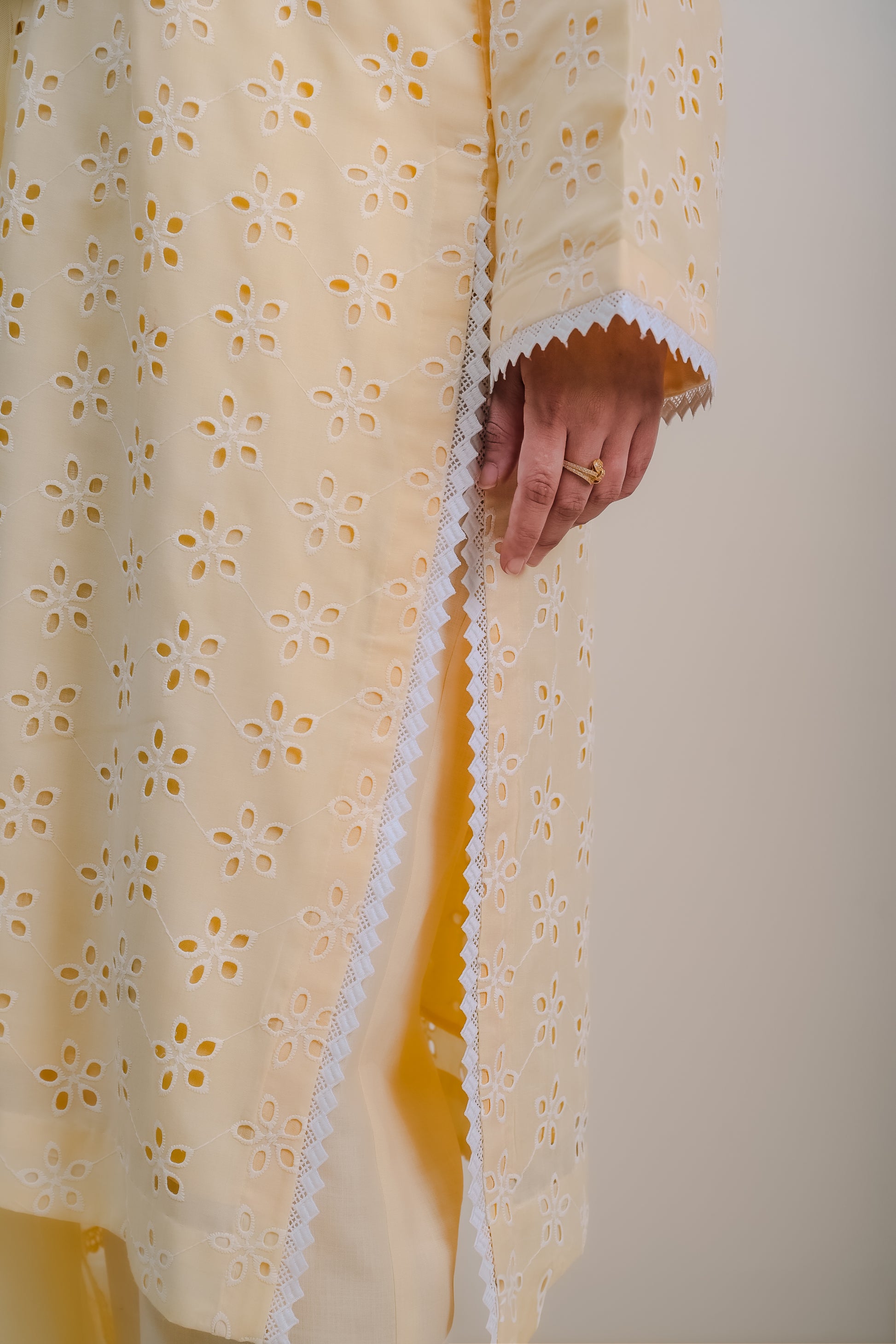 - Fully lined cut-work kurta features an elegant neckline and handcrafted lace detailing on sleeves and side slits