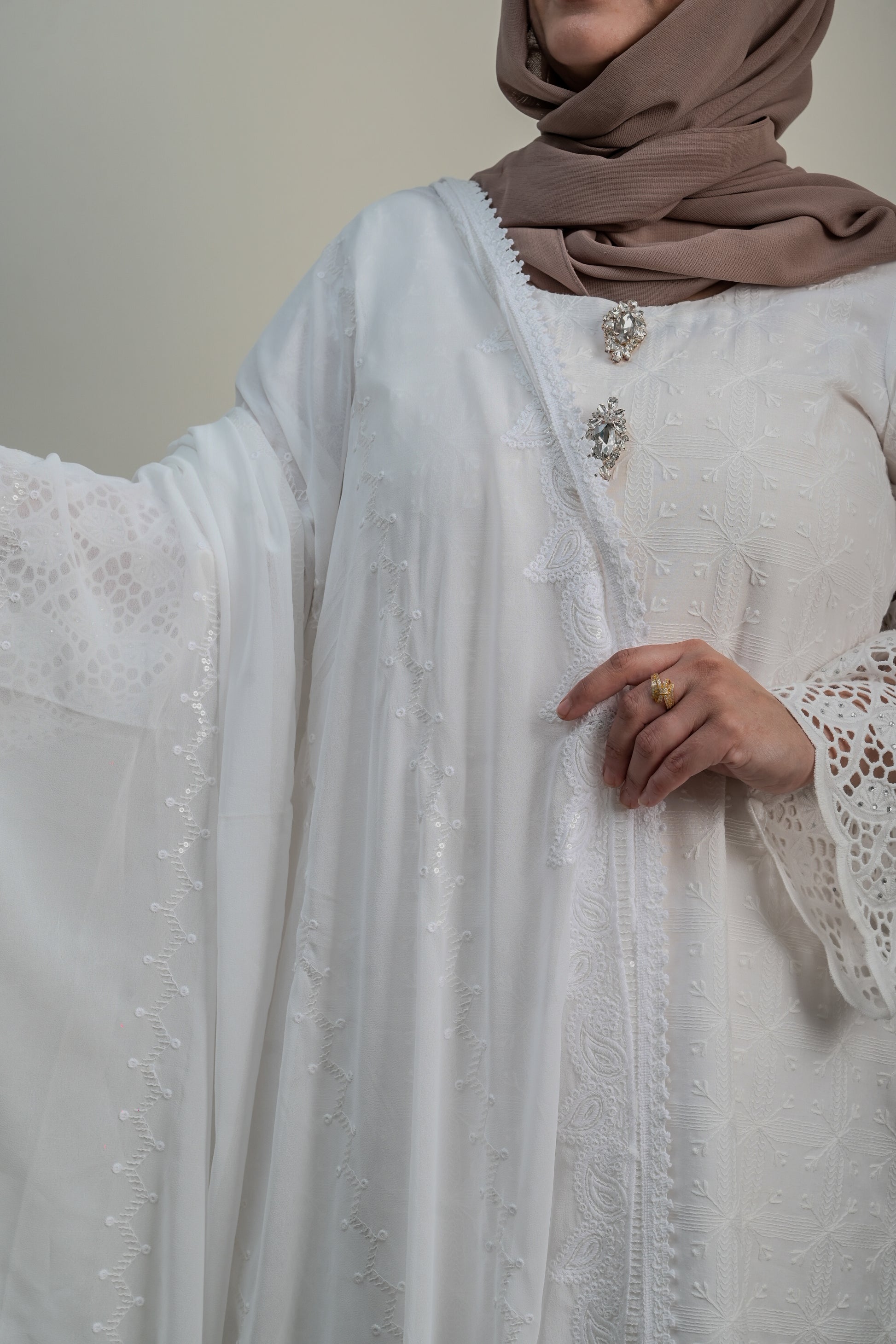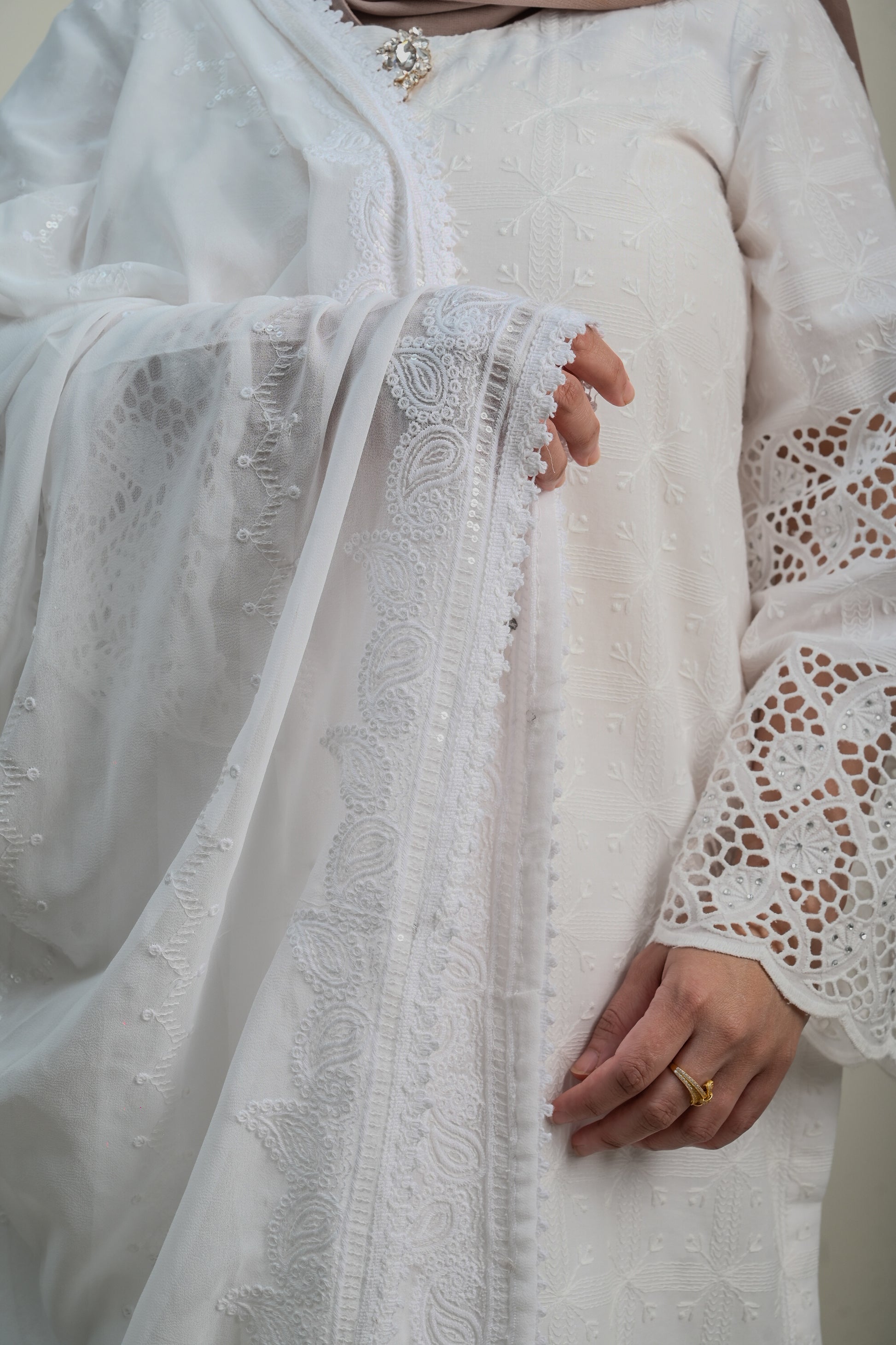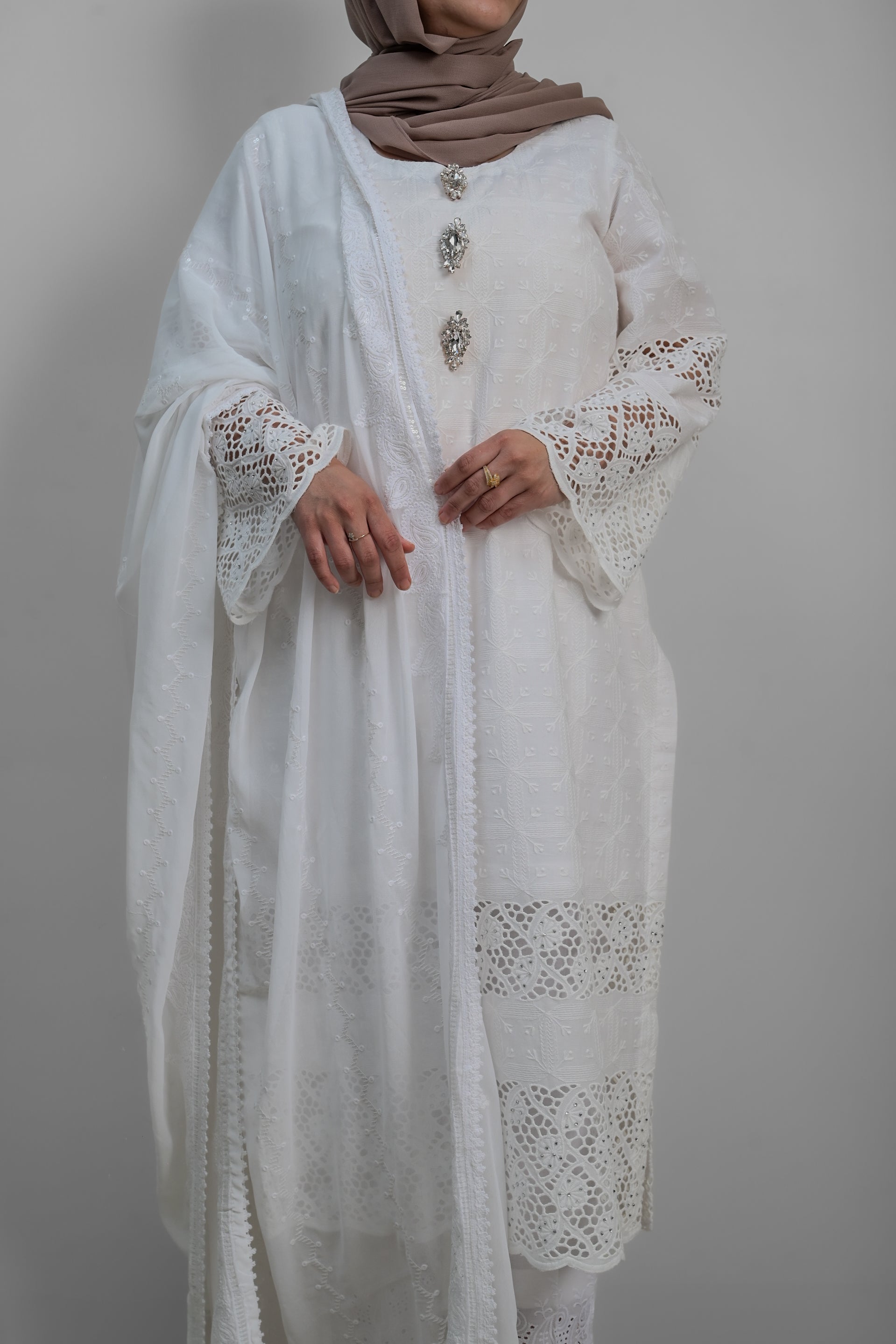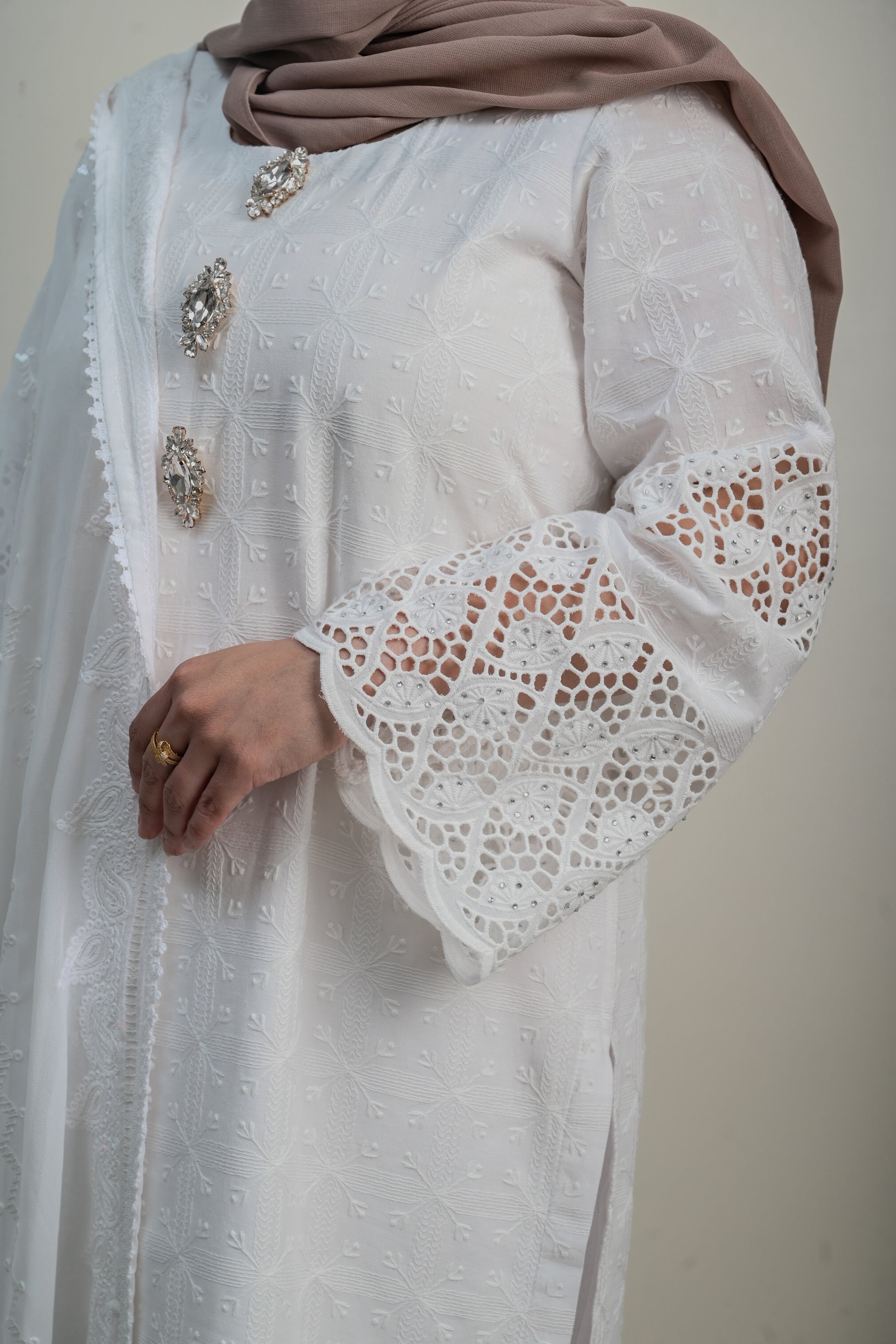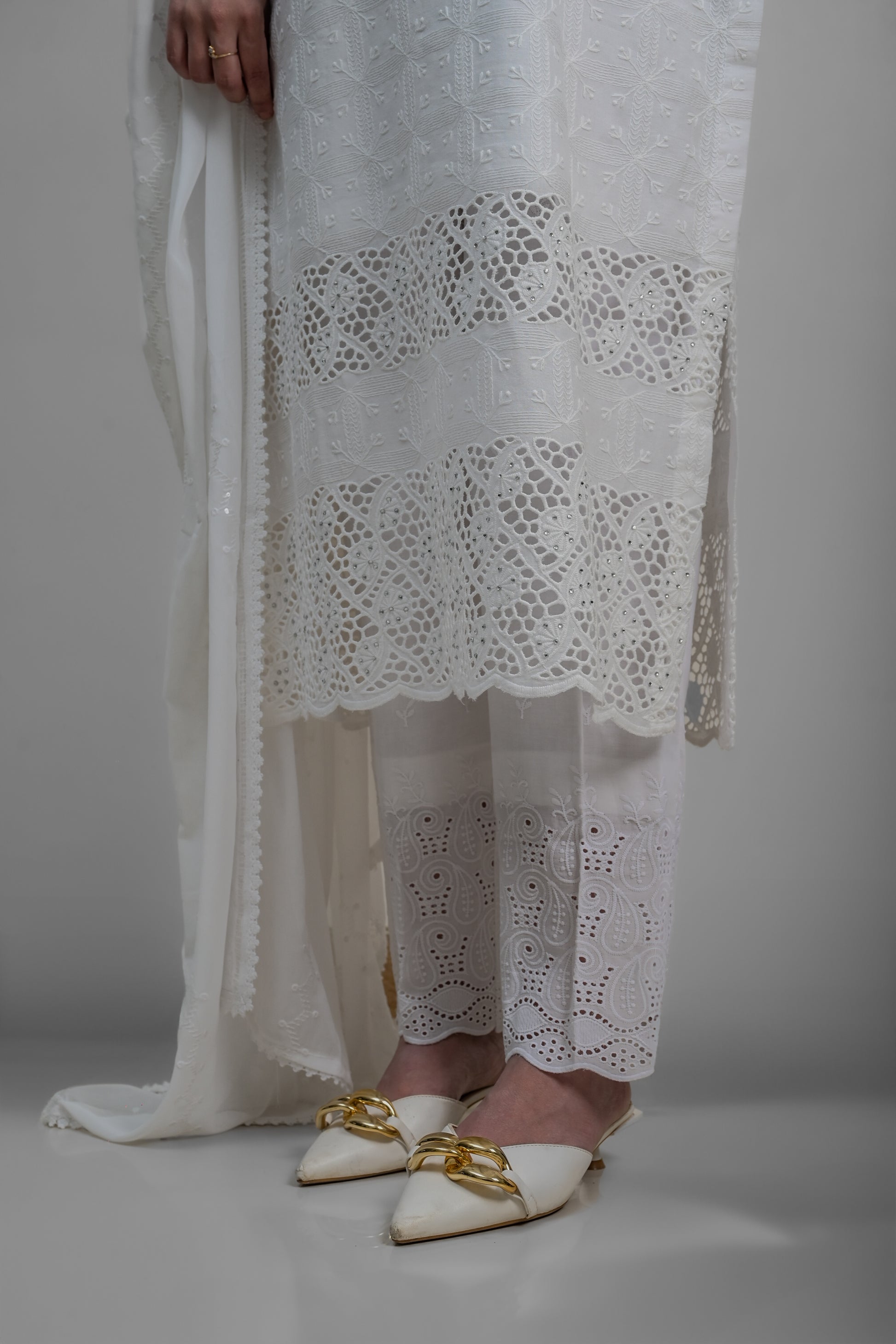 - Paired with premium soft cotton trousers with cutwork at the bottom